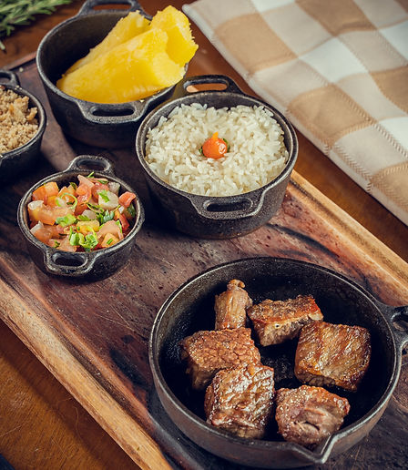 Cupim casqueirado, mandioca, queijo coalho, pão de alho, mandioca frita e farofa crocante.